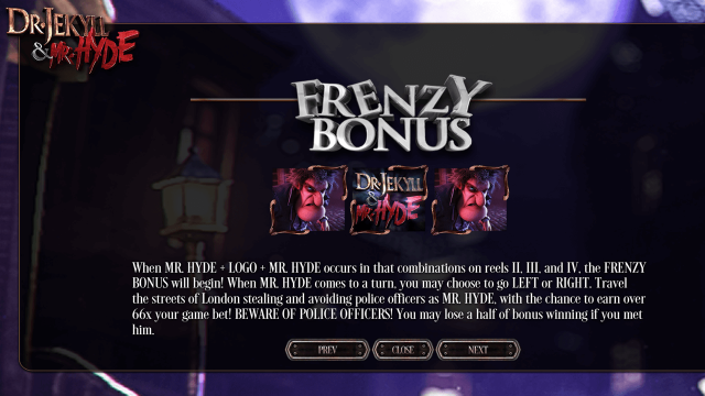Цепочка, состоящая из изображений Мистер Хайд-логотип-Мистер Хайд активирует призовую мини-игру. Задача гэмблера — выбрать, куда пойти (направо или налево). Если герой встретит прохожего, то получит награду, и тур продолжится. Встреча с полицейским завершит раунд. Комбинация доктор Джекилл-логотип-доктор Джекилл активирует мини-игру «Зелье». Геймеру необходимо выбрать элементы для приготовления лечебного эликсира. Он должен угадать 6 колб из 12. Чем быстрее он это сделает, тем выше будет вознаграждение.