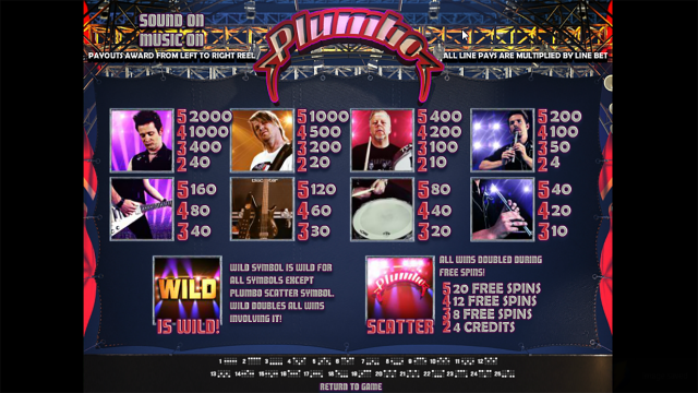 В виртуальном аппарате Plumbo прогрессивный джекпот не разыгрывается. Специалисты заявляют, что за один спин пользователи могут получить вознаграждение в размере 625000. Самый высокий коэффициент зафиксирован на отметке в 1000 монет и принадлежит комбинации из пяти символов с изображением солиста группы.