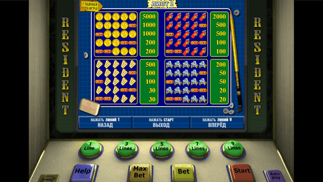 Аппарат Резидент гармонично сочетает в себе простые правила игры и увлекательные бонусные опции. Во время риск-игры пользователи в несколько раз могут увеличить сумму выплат. Приятно удивят высокие коэффициенты слота Шпион. Двухуровневая бонусная игра принесет солидные выигрыши. Недостаток виртуального аппарата — его несовременная графика и простое звуковое сопровождение.